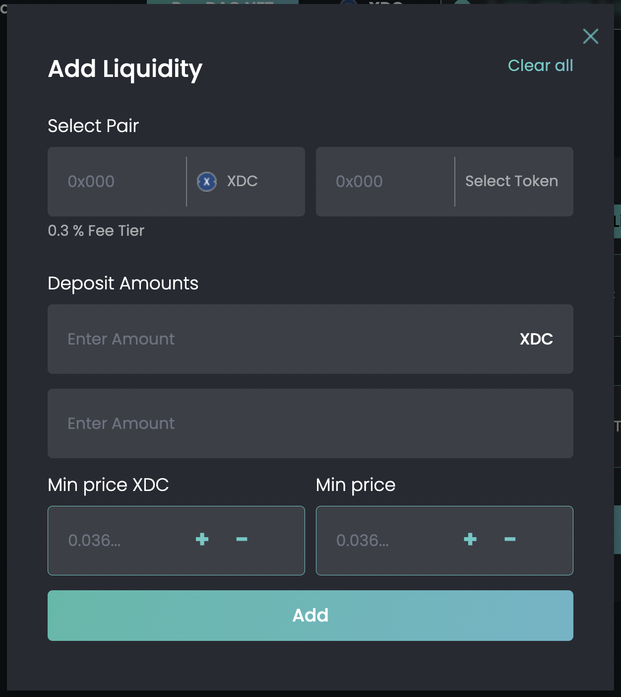 2. **Deposit Amounts**: Users enter the amount of each token they want to deposit. The DEX interface will typically display the minimum price for each token, ensuring users are aware of the exchange rate at which they are providing liquidity.